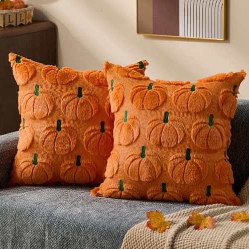 DFXSZ Höstigt kuddfodral, 46 x 46 cm, 2-pack, höstdekoration, orange, grön, gul, pumpa, prydnadskudde, fodral, mjuk plysch, fuskpäls, ull, för soffa, stol, sovrum, vardagsrum, hemdekor, PTK12R18