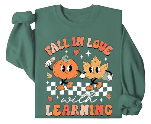 Hösttröjor för kvinnor bli kär i lärande tröja rolig retro höst pumpa lärare pullover huvtröja, gRÖN, XL