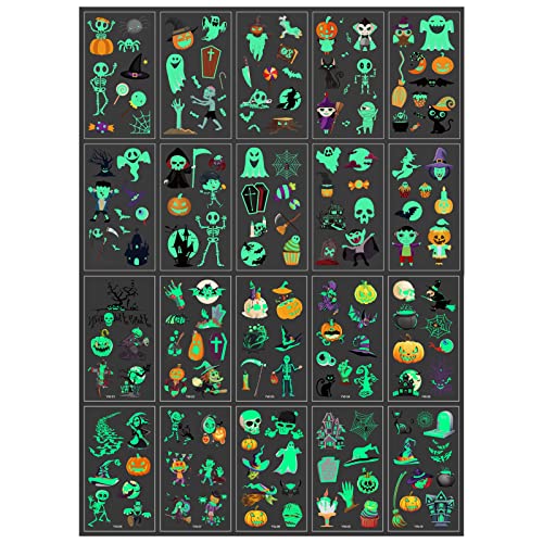 TOYMIS 200st Halloween Tillfälliga Tatueringar för Barn, Tillfälliga Glöd Tatueringar för Barn Vattentäta Självlysande Tatueringar Pumpa Skelett Häxa Skalle Mönster för Pojkar Flickor Halloweenfest