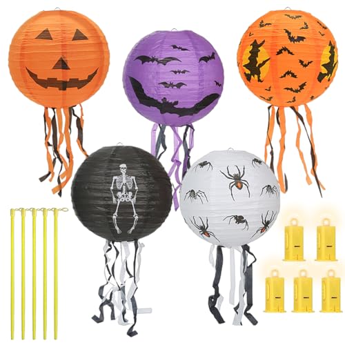 5 stycken halloween lampor, LED halloween lykta, halloween papperslykta, vikbar lampskärm papper, pumpa spindlar hängande festival lykta för Home Party halloween dekoration pojke flicka
