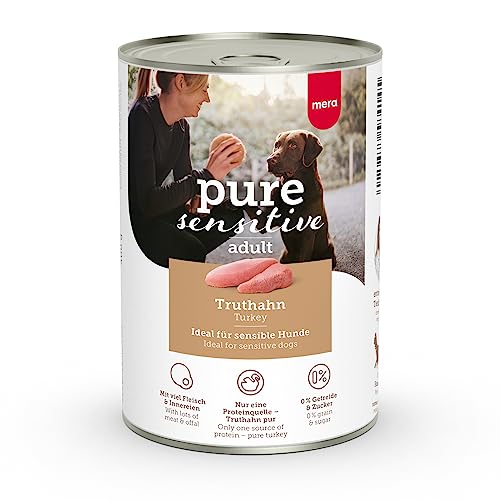 MERA Pure Sensitive kalkon (6 x 400 g), våt hundmat med hög kötthalt och spannmålsfri, våtfoder av 100% animaliskt protein för känsliga hundar, enkelt protein