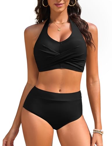 JFAN Dam 2-delade baddräkter hög midja push up bikini klassiskt set eleganta badkläder dam halter vintage bikini set, svart, XL