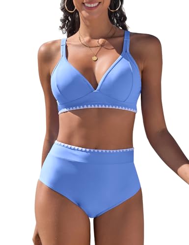 UMIPUBO Bikini dam set hög midja mage väg push up tvådelad v-ringad badmode hög midja färgblockering med mussla kanter badkläder, Ljusblå, M