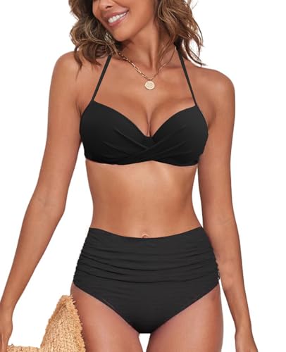 NLAND Dam Baddräkt Hög Midja Två Delar Bikini Set Push Up Vadderad BH med Twist Badbyxor Baddräkt med Justerbara Hängslen Badkläder (Svart, M)