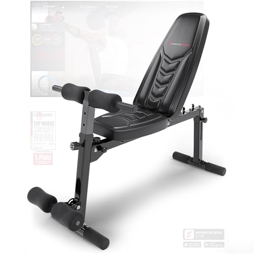 Sportstech Innovativ hantelbänk 8-i-1 med unik design av EVA-stoppningsmaterial | intelligent viksystem BRT500 vikbart | halkfria fötter | push-up-handtag | platt bänk med curlpult och affisch