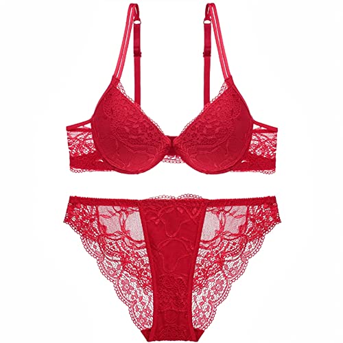 SHEKINI Push Up BH-set, dambygel-BH set, spetsbehå och trosa, inte avtagbar bh, trosa, underkläder, underkläder med krokstängning och justerbara remmar, Röd, 6177, 75C