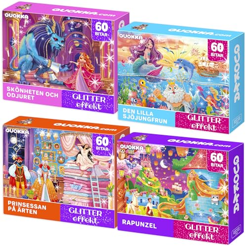 QUOKKA Pussel för åldrarna 4-5 - 4x60 bitar Skimrande Pussel för flickor i åldrarna 5-6 - Färgglada Pusselspel med Prinsessa, Enhörning, Sjöjungfru och Djur