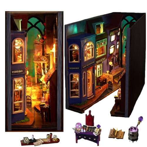 Book Nook DIY Magic World Kit med LED-ljus och dammtätt lock, pussel stopp trä 3D miniatyrer kreativa presenter, dekoration insats bokhylla bokhylla dockhus för vuxna tonåringar
