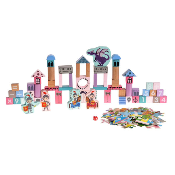 Träslott med riddare för barn 3+ Träfigurer + Formsorterare + Pusselmatta + Fiaspel
