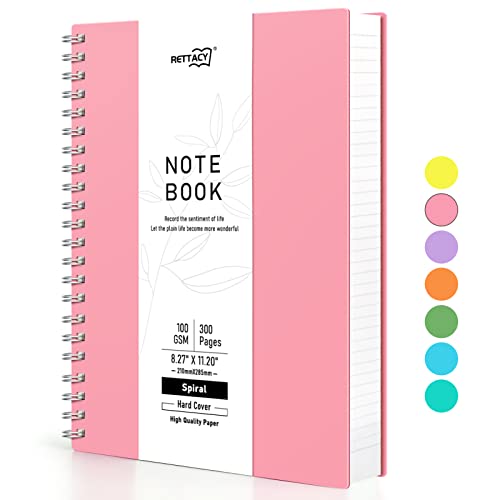 RETTACY A4 anteckningsblock, anteckningsbok, spiralbundna anteckningsböcker, 300 ark/150 sidor att skriva, 100 g/m² collegelinjerat papper, PVC-inbundet lock, 21,5 x 27,9 cm – rosa