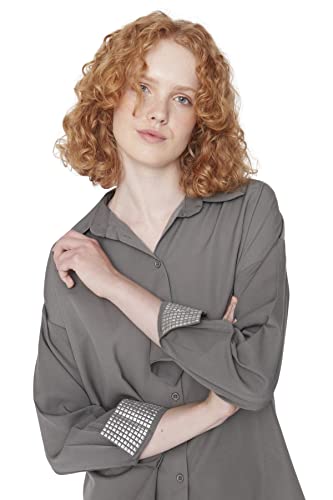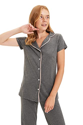 Trendyol Dam enkel passpoal detaljerad mitten stickad skjorta byxor pyjamas set, Antracit, XL