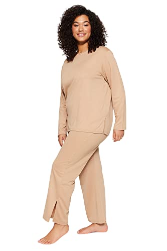 Trendyol Dam enfärgad stickad T-shirt-byxor plusstorlek pyjamas set, beige, 5XL, BEIgE, 5XL