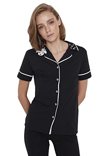 Trendyol Dam enkel passpoal detaljerad mitten stickad skjorta byxor pyjamas set, Svart, XL