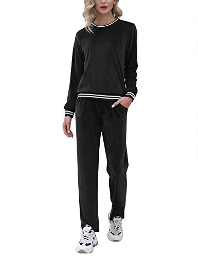 Doaraha Dam loungedräkt velour pyjamas sammet fritidsoverall modern hemmadräkt bekväm ribbkrage topp + sportkläder byxor för vår, höst och vinter, svart, XXL