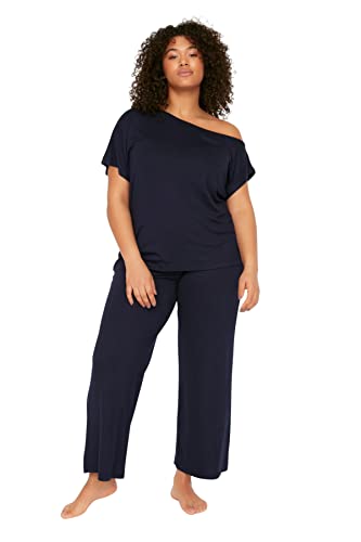 Trendyol Dam enkel vävd T-shirt-byxor plus storlek pyjamas set, marinblå, 6XL, marinblå, 6XL