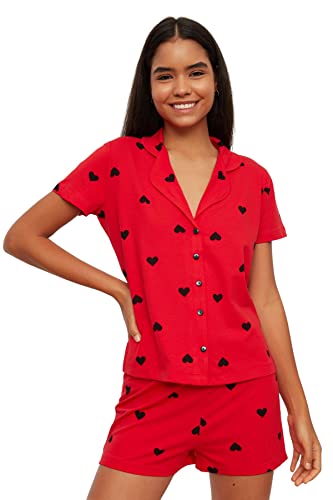 Trendyol Dam hjärta mitten stickad skjorta byxor pyjamas set, Röd, M