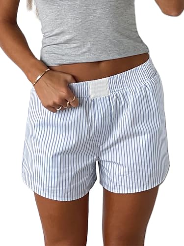 YILEEGOO Dam elastisk midja randiga/rutiga shorts pyjamas byxor myskläder sommar strandshorts breda ben boxershorts pojkshorts, Ljusblått, L