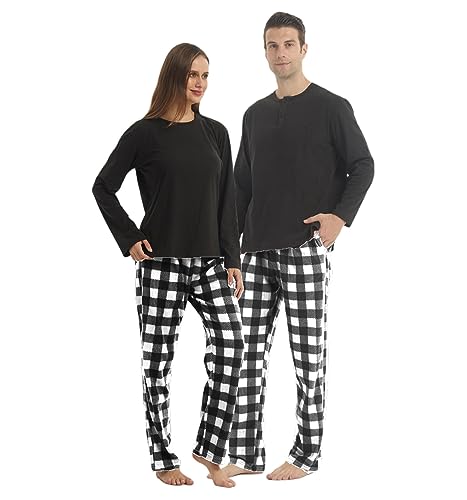 YUSHOW Matchande pyjamas par jul fleece vinter varm partner pyjamas set om 2 för par långa toppar rutiga byxor julpyjamas set, Vit svart rutig (dam), L