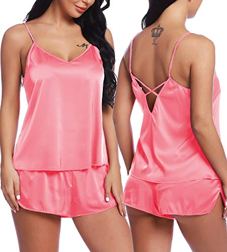 RSLOVE Dam V-ringad satin underkläder pyjamas set sexig cami och shorts set nattkläder, Rosa, L