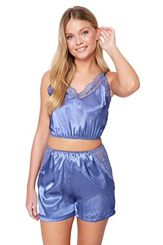 Trendyol Dam vanligt vävd linne-shorts pyjamas set, Indigo, 64