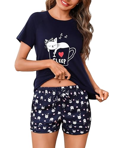 Bresdk Pyjamas, dam, kort, bomull, tvådelad, kortärmad, pyjamas-set med shorts, kvinnor, sommar, nattkläder, Blå katt, M