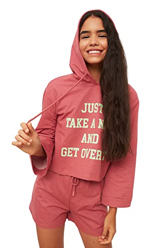 Trendyol Kvinnor med slogan stickad tröja shorts plus storlek pyjamas set pyjamas dam, Pulver, 4XL