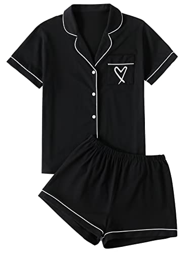 LYANER Dam pyjamas set hjärta tryck knapp kortärmad skjorta med shorts nattkläder pyjamas set, Svart, M