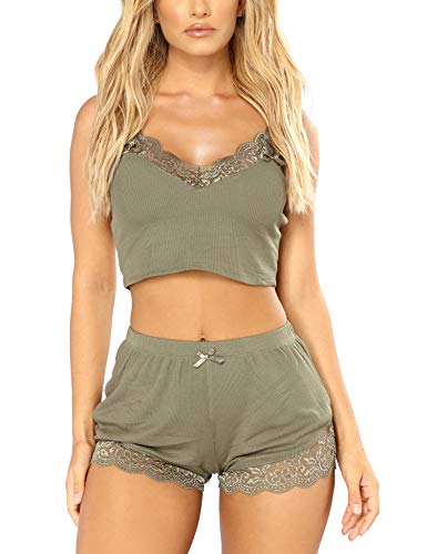 RSLOVE Dam spets linne och shorts V-ringad ärmlös nattkläder pyjamas set nattkläder, Oliv, L
