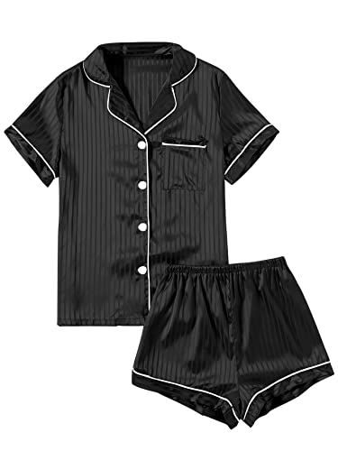 LYANER Dam randig silkeslen satin-pyjamas kortärmad topp med shorts nattkläder pyjamas set, Svartnr 2, S