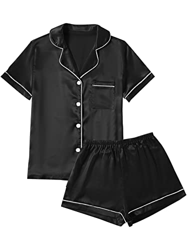 LYANER Dam satin pyjamas set kortärmad knapp skjorta silkeslena nattkläder med shorts set PJ, Svart, S