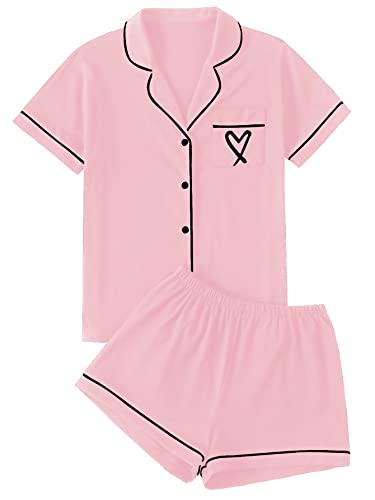 LYANER Dam pyjamas set hjärta tryck knapp kortärmad skjorta med shorts nattkläder pyjamas set, Rosa, S