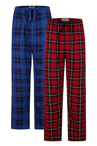 GLOBAL Pyjamasbyxor för män, 100 % bomull, flanell, Röd rutig och blå rutig, M