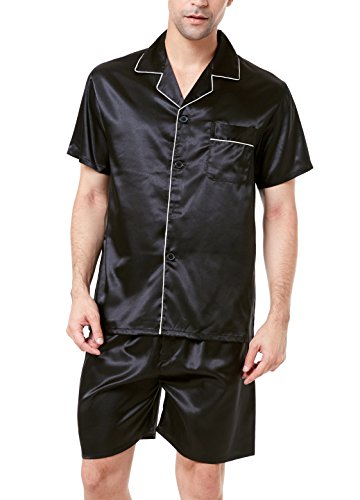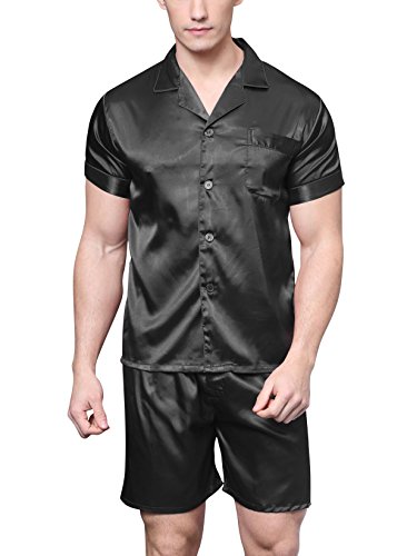 Kort satinpyjamas för män, kortärmad pyjamas-set med shorts, svart, L