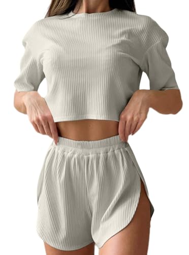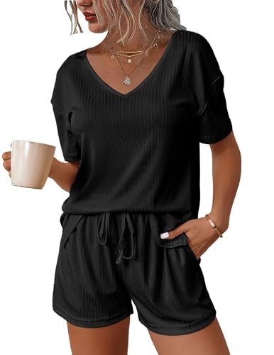 Ekouaer Dam ribbstickad loungeuppsättning kortärmad topp och shorts nattkläder pyjamasset två delar shorts outfits set, Svart, M