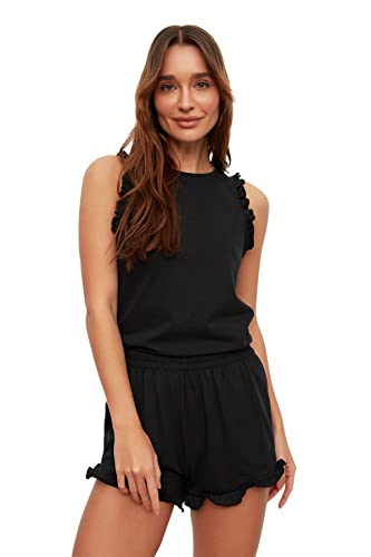 Trendyol Dam vanlig volang detaljerad mitt stickad linne - shorts pyjamasset, Svart, M