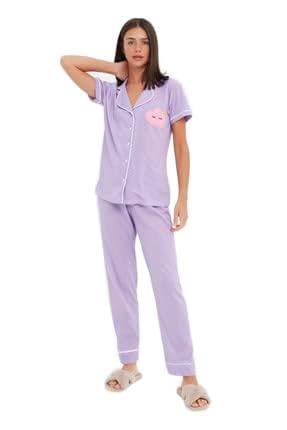 Trendyol Dam vanligt mellanvävt linne - shorts pyjamasset, Lila, M
