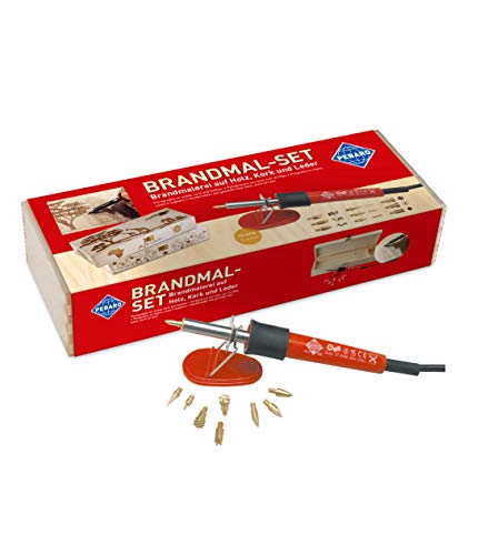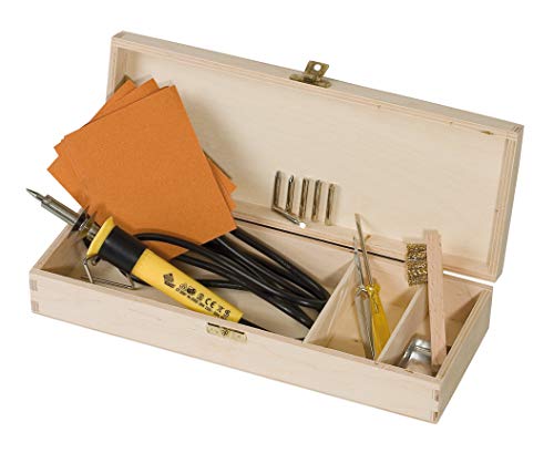 Pebaro 0285 brandmal pysselset i en vacker trälåda: brandmålningskolvar, 3 brännspetsar, 5 brännstämplar, brandmålning, pyrografi, träbränning, skriva, rita, bränna på trä, läder, kork etc.