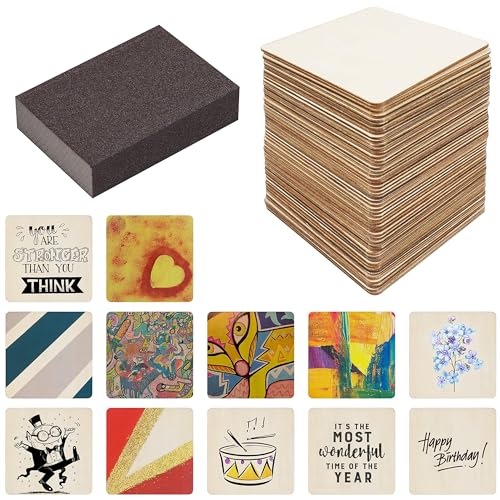 Belle Vous 50 Pack Ofärdiga Blanka Fyrkantiga Träbitar med Slipblock – 10 x 10 cm – 2,5 mm Tjocka Platta Fyrkantiga Träbitar för DIY Underlägg, Hantverk, Färg och Pyrografi Bränning