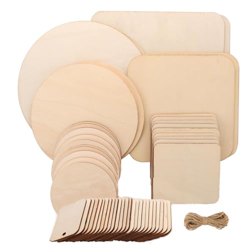 Wenrescry 54 stycken obehandlade träplattor för pyssel, runda och kvadratiska, för målning, graffiti, pyrografi och dekoration, med hamparep och 7 storlekar