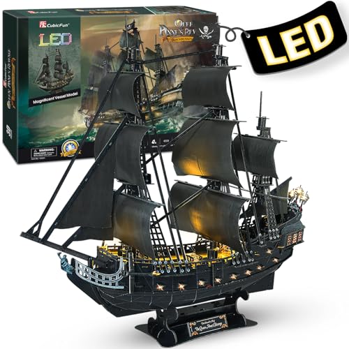 CubicFun 3D-pussel LED 68 cm svart pärla – drottning Anne's Revenge stort modellskepp, födelsedagspresent för vuxna, 340 stycken (1/95 LED Queen Anne's Revenge)