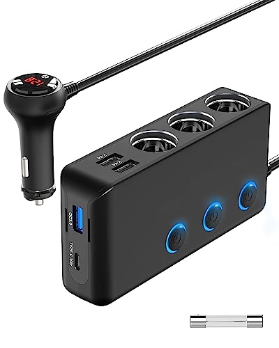 Quick Charge 3.0 och USB C 20W Splittersändare för cigarettändare, Qidoe 200W 12V/24V Splitter för bilens strömuttag med 3 uttag, 4 portar och LED-voltmätarströmbrytare
