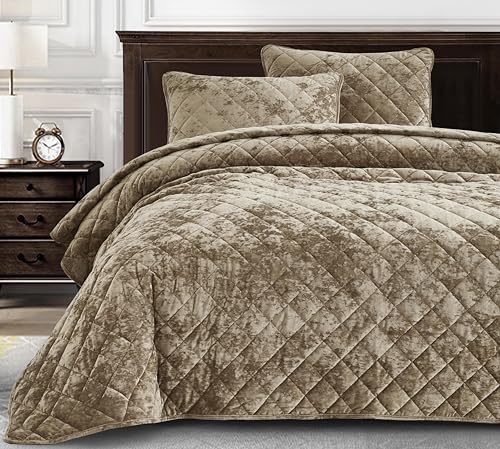 Chezmoi Collection Lux Tan Velvet Quilt överdimensionerad King Set, 3-delad plysch sliten sammet sängkläder alla årstider lätt täcke borstad mikrofiber omvänd med diamantsöm quiltning