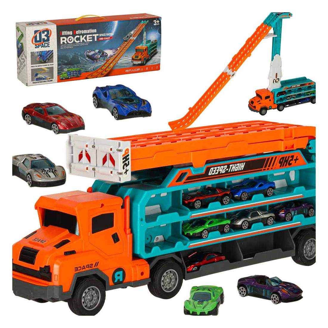 Beast Track biltransport med utfällbar racerbana och 2 bilar