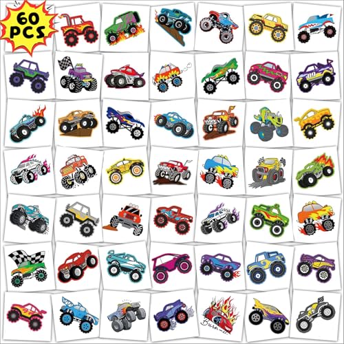 Qpout 60 st Monster Truck tillfälliga tatueringar för barn, racerbil lastbilshjul falska tatueringsdekaler för barn racingbil födelsedagsfest favoriter tillbehör