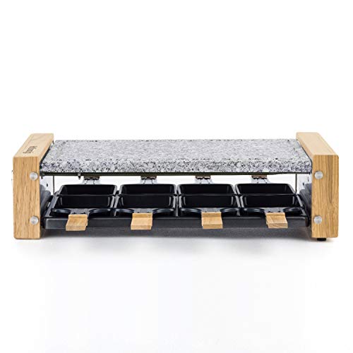H.Koenig multifunktionell racletteapparat 8 personer WOD8 naturträdesign, avtagbar granitsten, professionell ostfondue-raclette, 8 non-stick belagda stekpannor, 8 träspatlar