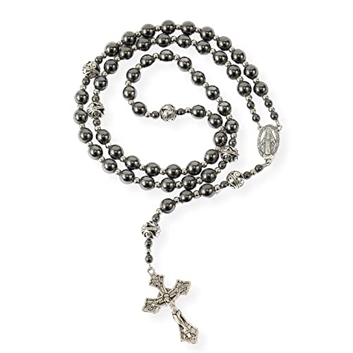 Nazareth Store Hematit 8 mm pärlor radband svart sten katolskt radband halsband metall pärlor mirakulös medalj med rostfritt kors, 55cm, Metall, Hematit