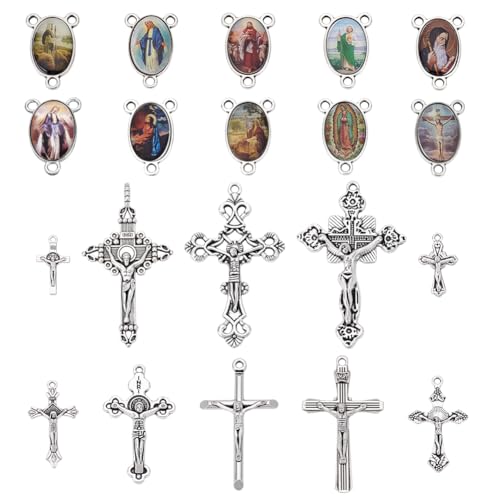 PandaHall Elite 10 uppsättningar (20 stycken) radband kors och center underbar medalj med krucifix kors hänge och oval bild vänster för radband halsband nyckelring, Metall