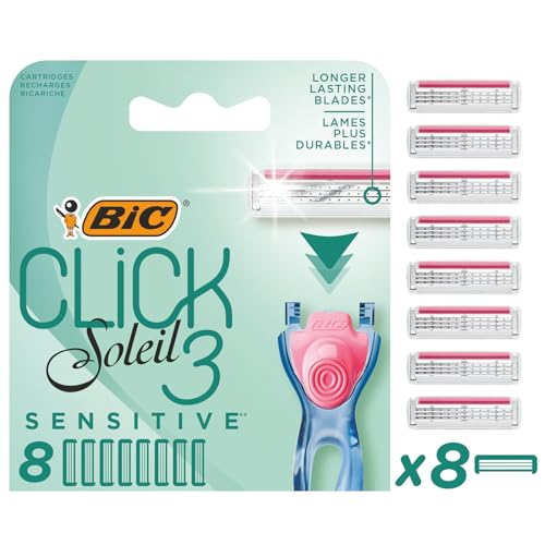 BIC Rakblad för kvinnor, rakapparat, klick, 3 Soleil Sensitive, 8 påfyllningspaket för den närande våt rakapparaten med 3 blad
