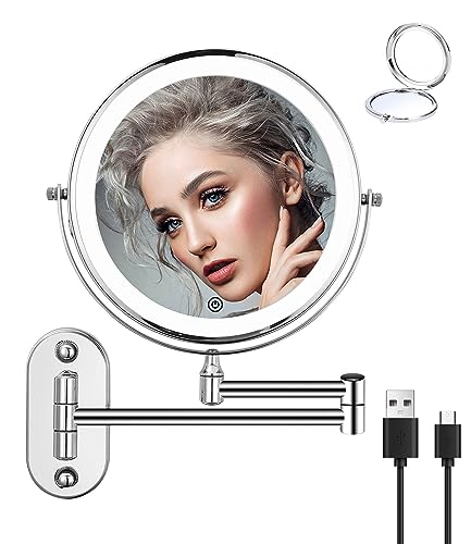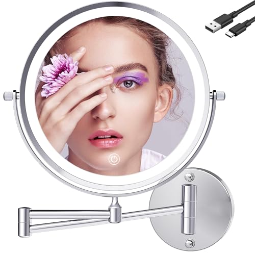 FUNTOUCH Uppladdningsbar väggmonterad upplyst sminkspegel, 20 cm dubbelsidig 1X / 10X förstorande badrum sminkspegel, 3 färgbelysning, pekskärm dimning, utökad arm, 360 rotation rakspegel