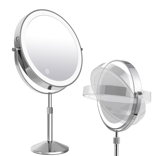 8 tums fast väggmonterad LED-upplyst sminkspegel med pekskärm dimbar, dubbelsidig roterbar 10X förstorande kosmetisk skönhetsspegel, HD-rakspegel för badrum,Silver,1Color
